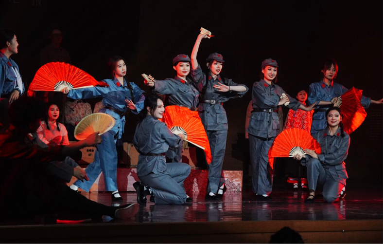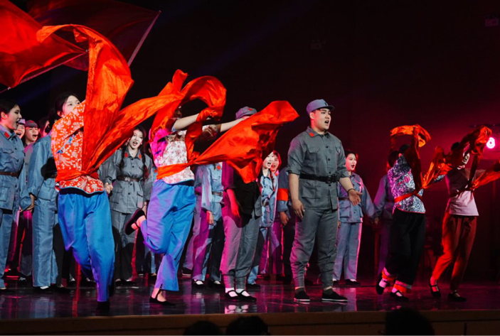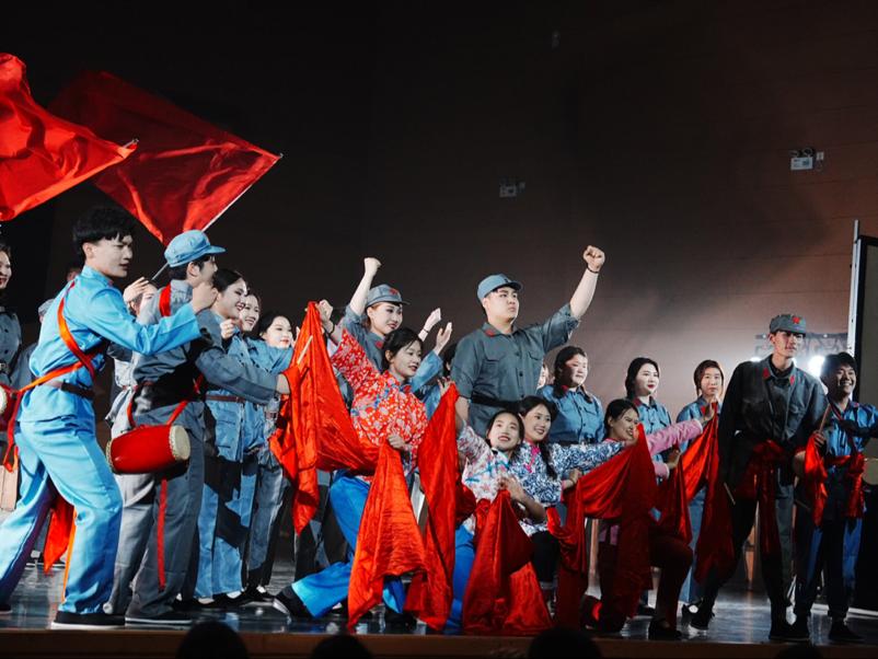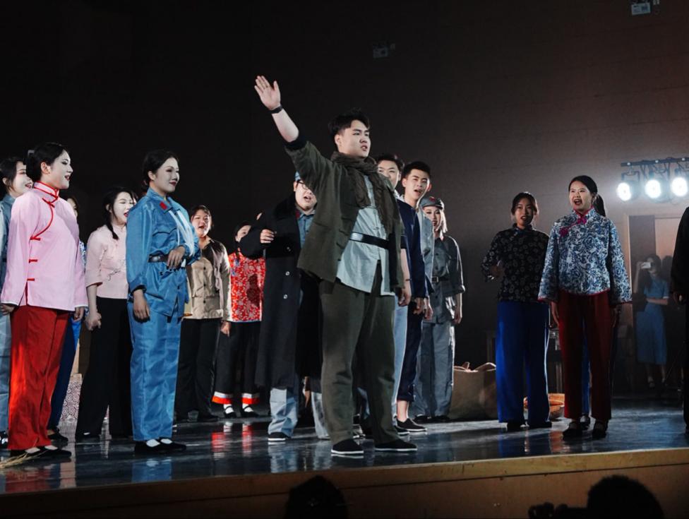 在全体演员演绎的歌剧《长征》中胜利会师的场面中,同学们扭起秧歌,打起腰鼓,将音乐会的气氛推向了高潮。