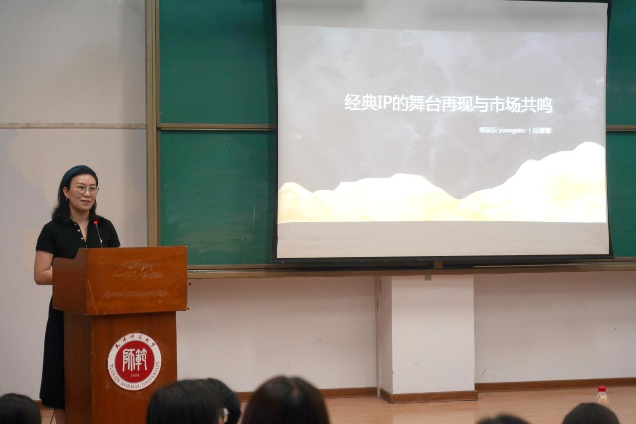 徐珊珊曾任浙江大船文化发展有限公司运营中心品牌总监、天津大船文化发展有限公司总经理,已在天津等地运营举办 200 余场演出,在业界中具有多年丰富的运营经验,曾主办舞蹈诗剧《只此青绿》、亚洲爱乐乐团天津城市新年音乐会等大型演出。同学们纷纷表示,徐珊珊在讲座中有很多独特见解,提出对于中国舞剧音乐剧的IP改编全新的思考视角,让大家对于艺术创作的思考更加深入,在传统文化IP的创作路上有了新的方向。