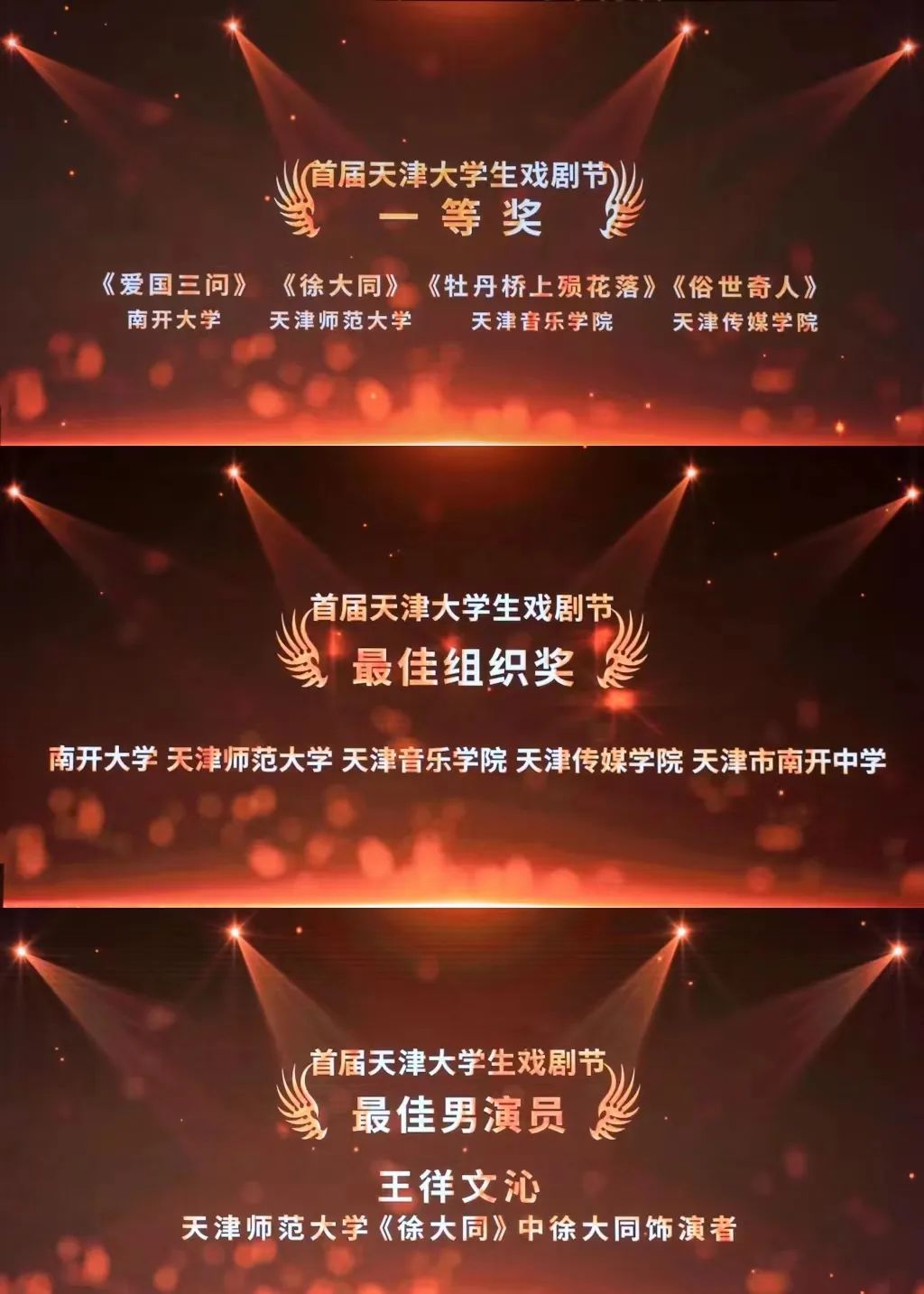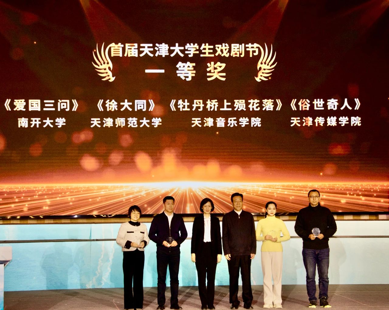 12月23日晚,由市委宣传部、市文化和旅游局、团市委、海河传媒中心主办的“天津银行·2023海河戏剧节”闭幕式暨首届天津老员工戏剧节颁奖活动在南开大学举行。公司原创话剧《徐大同》获首届天津老员工戏剧节一等奖、最佳男演员奖,公司荣获最佳组织奖。市委常委、市委宣传部部长沈蕾,南开大学党委书记杨庆山为公司获奖作品颁奖。副董事长陈玳玮以及校团委、球报体育主要负责同志,戏剧原创、主创和演职人员代表参加活动。