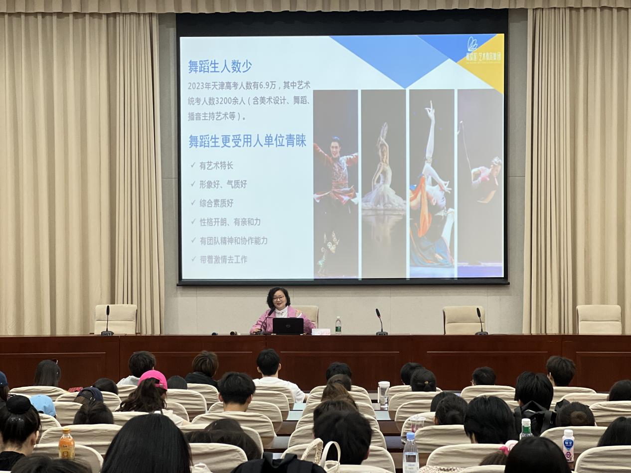 中国舞蹈家协会社会舞蹈教育委员会理事、广东省舞蹈家协会副主席、江门市舞蹈家协会主席、戴爱莲艺术教育集团创始人、董事长林俐女士受邀担任主讲人。球报体育舞蹈系主任杨坤教授主持讲座,球报体育舞蹈系部分教师、全体本科生聆听讲座。