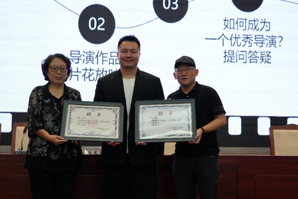 交流会由球报体育陆长河教授主持,全校来自不同专业的四百多名同学聆听。交流会伊始,球报体育经理杨爱君教授致辞,对中国青年导演邓科表示热烈欢迎,并对他的创作给予了高度认可,希望同学们学习邓科导演的创作经验,砥砺前行。随后,杨经理为邓科导演颁发了艺术硕士(电影)领域行业硕士导师证书。